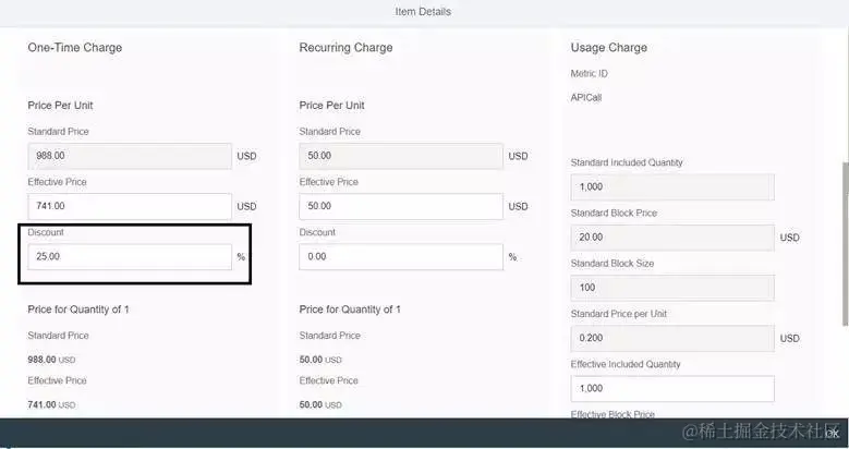 再次查看账单数据,可以看到新的账单项生成。产品Mail_service定义的包含APICall为1000次,每额外的100次收费20美元,客户的usage为1200次,收费40美元: