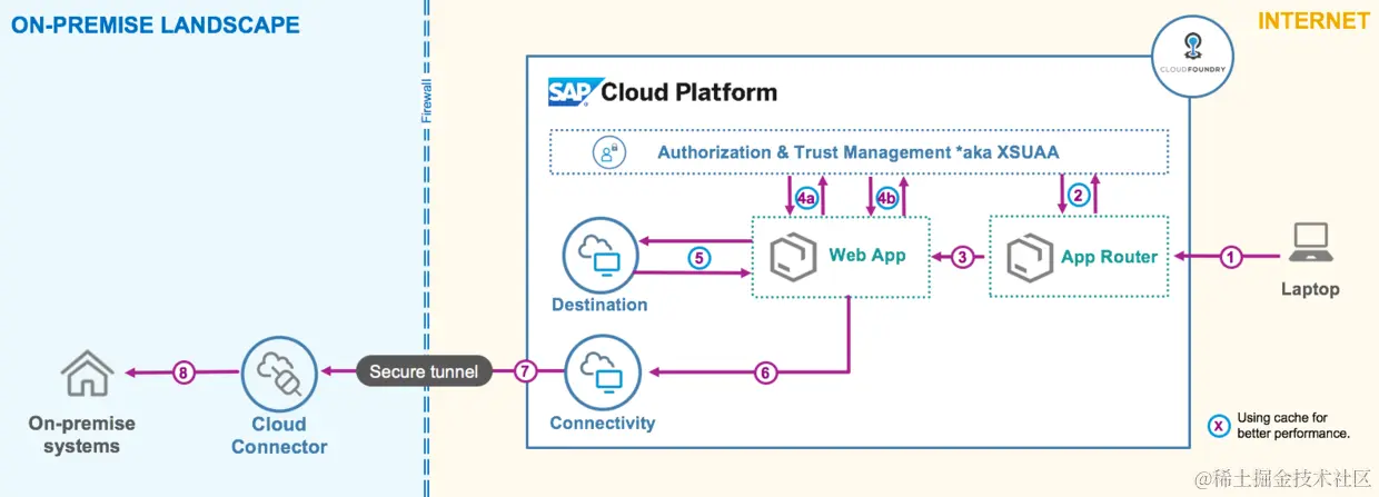 上图1~8的图例描述了部署在SAP云平台CloudFoundry环境上的Web应用是如何通过Cloud Connector访问On-Premise系统上的服务。