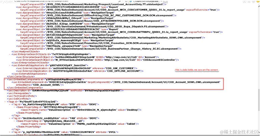 首先,我们知道在UI Designer里面画好了页面后,会生成对应的XML文件存储在ABAP后台。同时,我们在UI Designer里面也可以看到生成的XML文件: