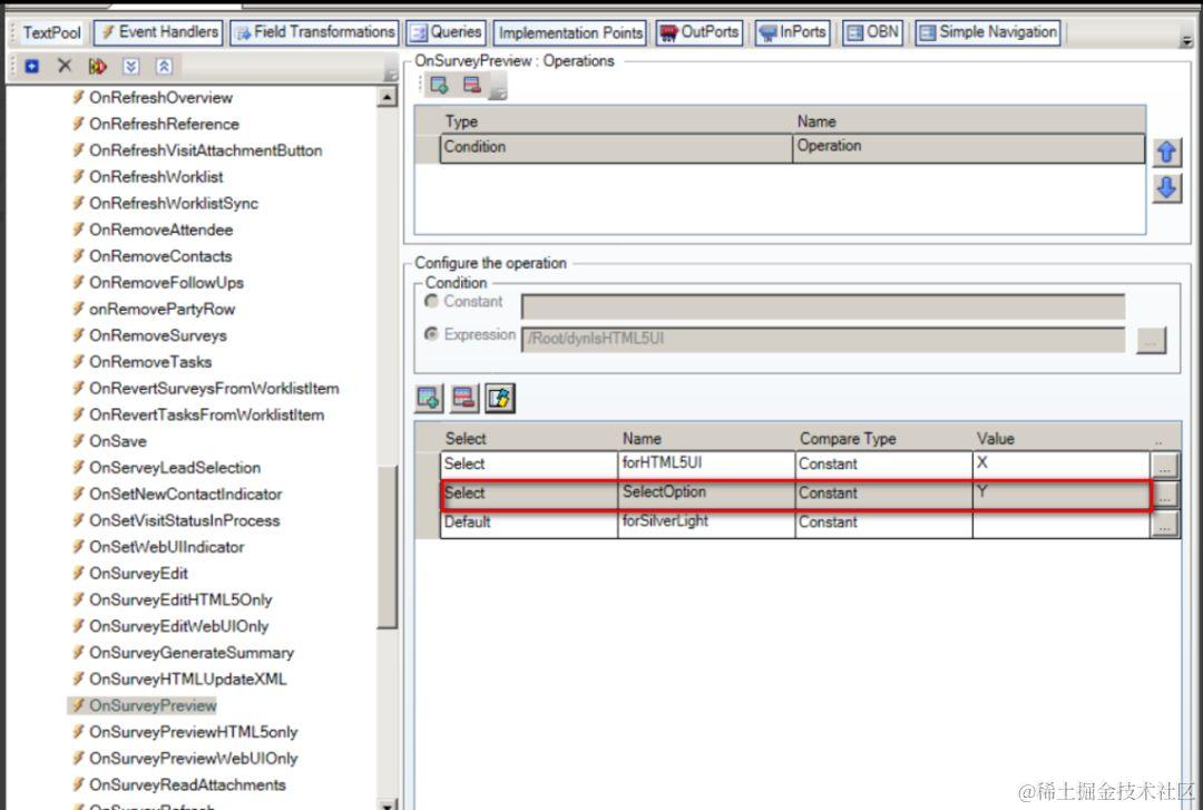 OnSurveyPreview的处理有三个分支,这不难理解。因为前面说过C4C有三套UI,SilverLight,HTML5和RUI。尽管这三套UI共享同一个UI Designer的开发视图,然而点击超链接后的跳转逻辑略微有差异,因此在OnClick处理函数OnSurveyPreview里分三个分支处理。下图中间红色区域的分支代码在RUI里点击超链接的跳转实现。