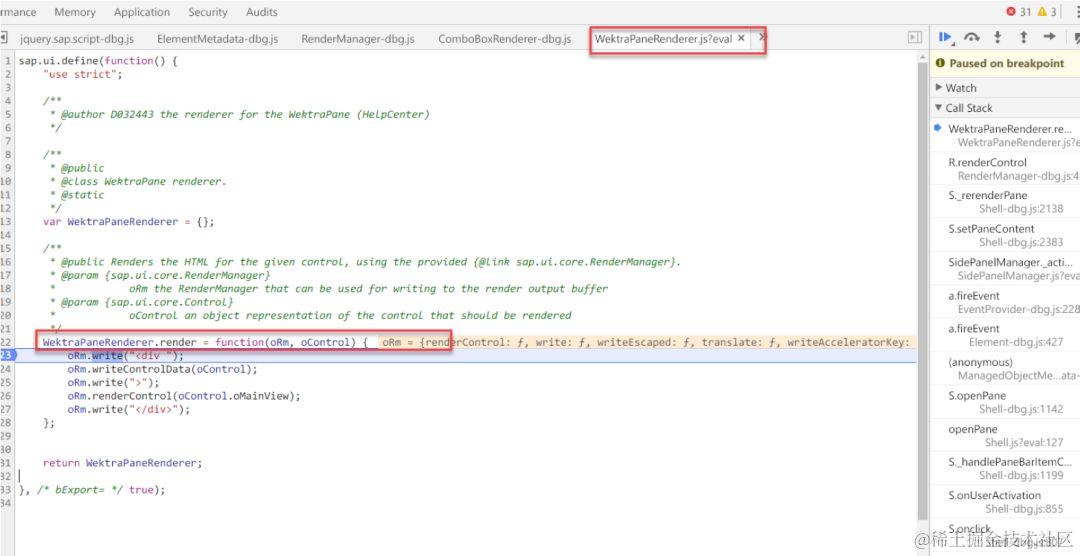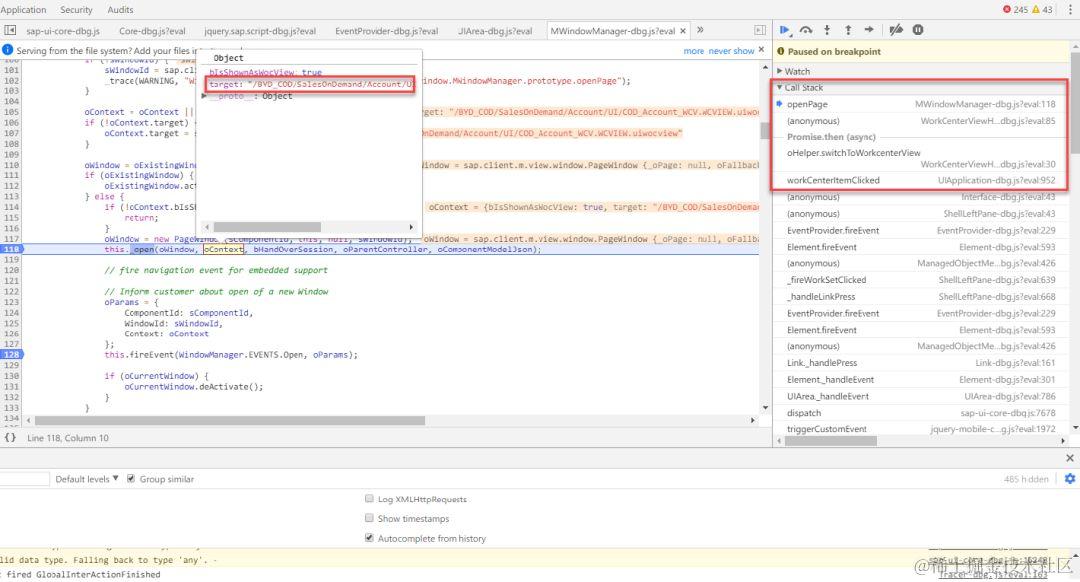 运行时有一个JavaScript对象来打开窗口,该对象的实现位于文件MWindowManager.js。我们在这里打断点可以看出_open方法触发了整个页面的渲染。当我们点击Account工作中心视图的时候,会把视图所在路径传入此方法。