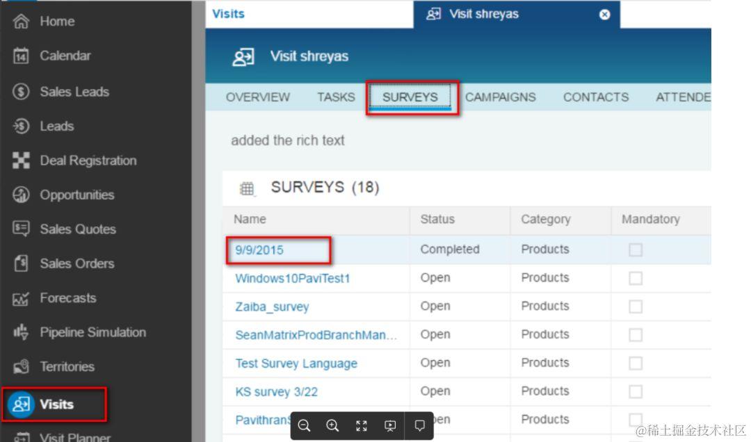 以Visit工作中心为示例,选择某个survey打开: