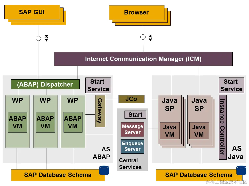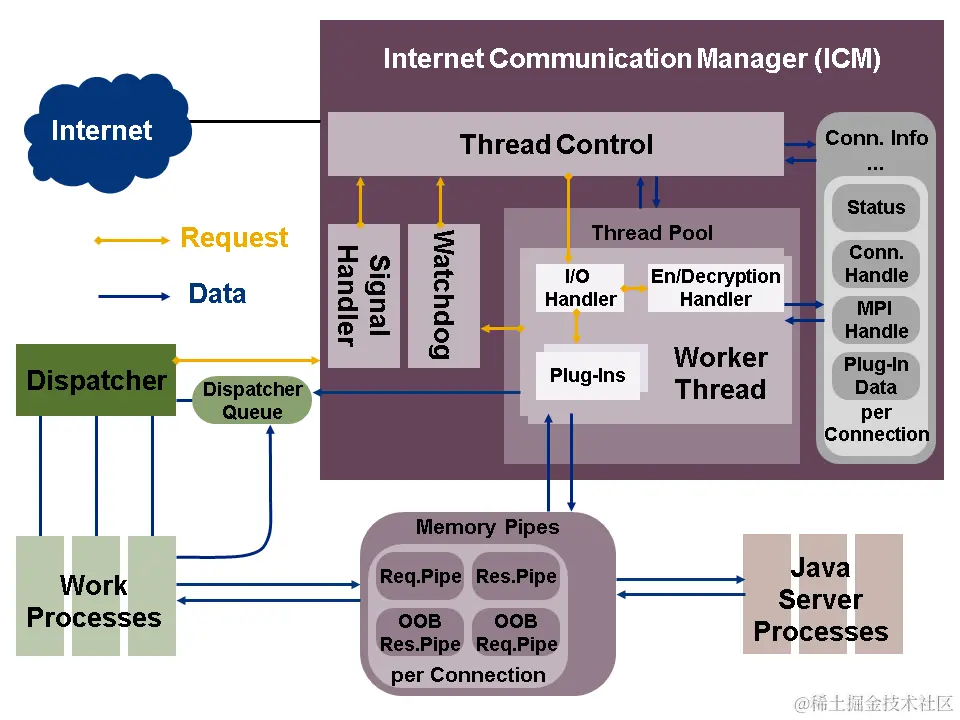 即ICM作为沟通的桥梁,确保Netweaver应用服务器和外界能够通过HTTP,HTTPS等协议交互。ICM是Netweaver应用服务器的一个组件,作为一个单独的工作进程,由ABAP dispatcher启动并监控。