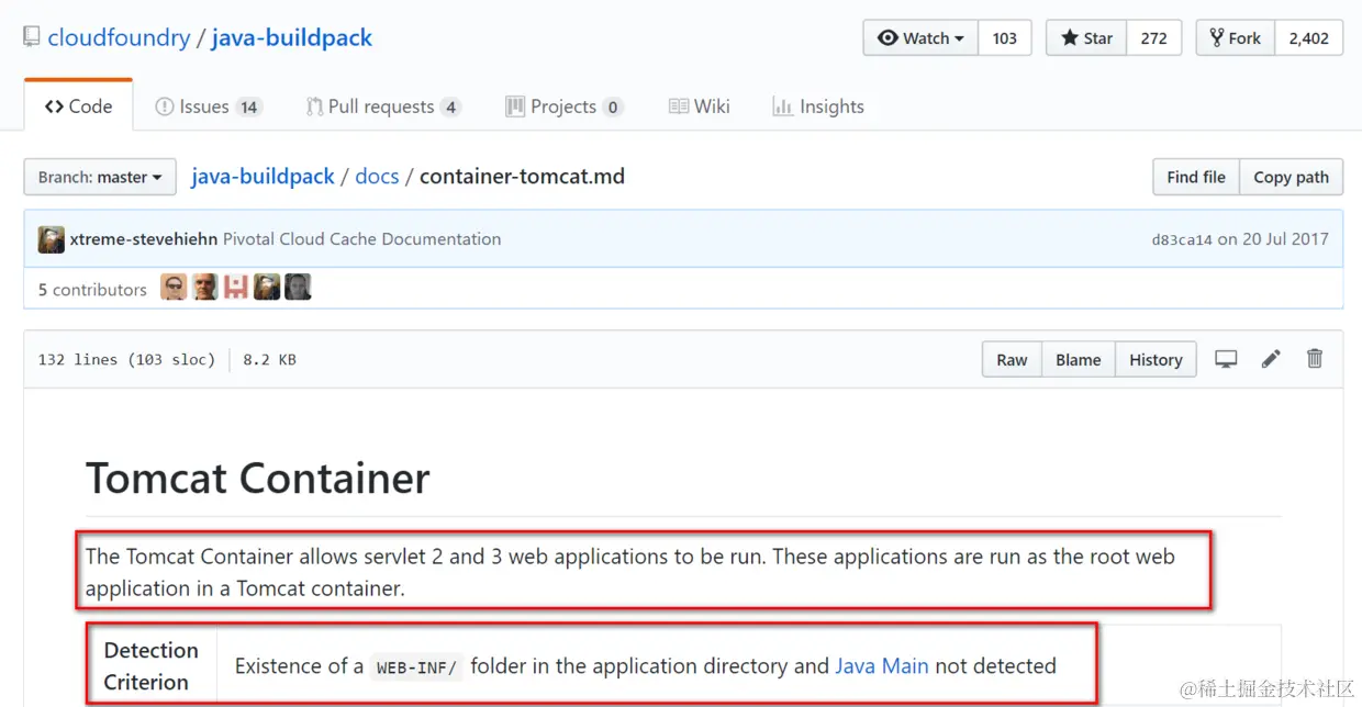 一旦buildpack检测到war包中存在WEB-INF,且不存在Java Main(实现了main方法的Java类),则决定使用Tomcat容器。