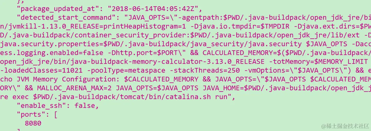 “JAVA_OPTS=\”-agentpath: PWD/.java−buildpack/openjdkjre/bin/jvmkill−1.13.0RELEASE=printHeapHistogram=1−Djava.io.tmpdir= P W D / . j a v a − b u i l d p a c k / o p e n j d k j r e / b i n / j v m k i l l − 1.13.0 R E L E A S E = p r i n t H e a p H i s t o g r a m = 1 − D j a v a . i o . t m p d i r = TMPDIR -Djava.ext.dirs= PWD/.java−buildpack/containersecurityprovider: P W D / . j a v a − b u i l d p a c k / c o n t a i n e r s e c u r i t y p r o v i d e r : PWD/.java-buildpack/open_jdk_jre/lib/ext -Djava.security.properties= PWD/.java−buildpack/javasecurity/java.security P W D / . j a v a − b u i l d p a c k / j a v a s e c u r i t y / j a v a . s e c u r i t y JAVA_OPTS -Daccess.logging.enabled=false -Dhttp.port=PORT\" && CALCULATED_MEMORY= PORT\" && CALCULATED_MEMORY= ( PWD/.java−buildpack/openjdkjre/bin/java−buildpack−memory−calculator−3.13.0RELEASE−totMemory= P W D / . j a v a − b u i l d p a c k / o p e n j d k j r e / b i n / j a v a − b u i l d p a c k − m e m o r y − c a l c u l a t o r − 3.13.0 R E L E A S E − t o t M e m o r y = MEMORY_LIMIT -loadedClasses=11021 -poolType=metaspace -stackThreads=250 -vmOptions=\”JAVA_OPTS\") && echo JVM Memory Configuration: JAVA_OPTS\") && echo JVM Memory Configuration: CALCULATED_MEMORY && JAVA_OPTS=\” JAVAOPTS J A V A O P T S CALCULATED_MEMORY\” && MALLOC_ARENA_MAX=2 JAVA_OPTS= JAVAOPTSJAVAHOME= J A V A O P T S J A V A H O M E = PWD/.java-buildpack/open_jdk_jre exec $PWD/.java-buildpack/tomcat/bin/catalina.sh run”,