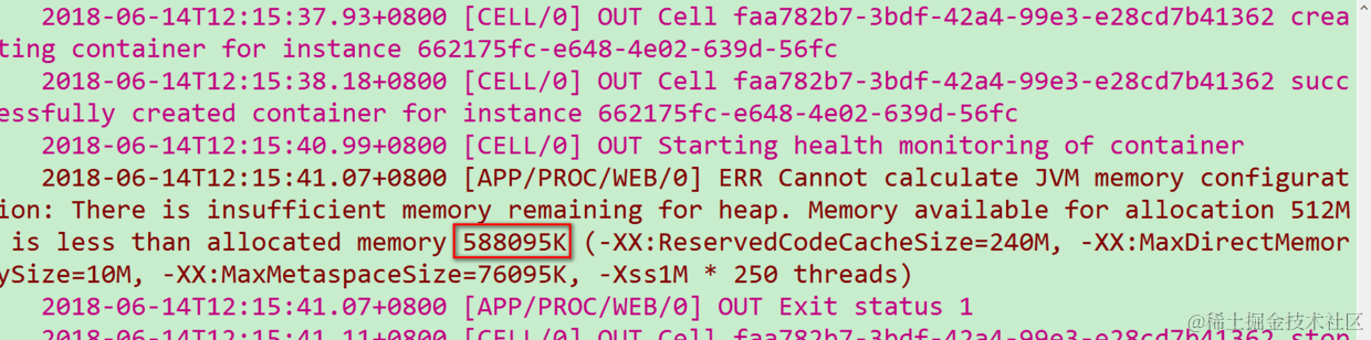 从返回的日志我们能清楚看到应用部署后CRASH的原因为manifest.yml里为应用分配的512M不够大。