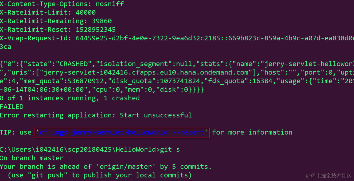此时可以使用命令cf logs –recent来查看服务器端日志: