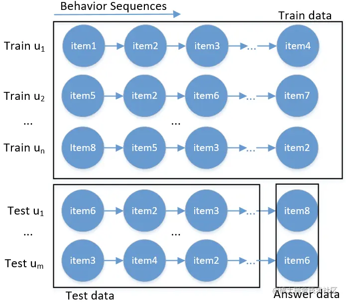 目标是基于用户历史点击行为,来预测下一次用户会点击的item,即**「next-item prediction」**。