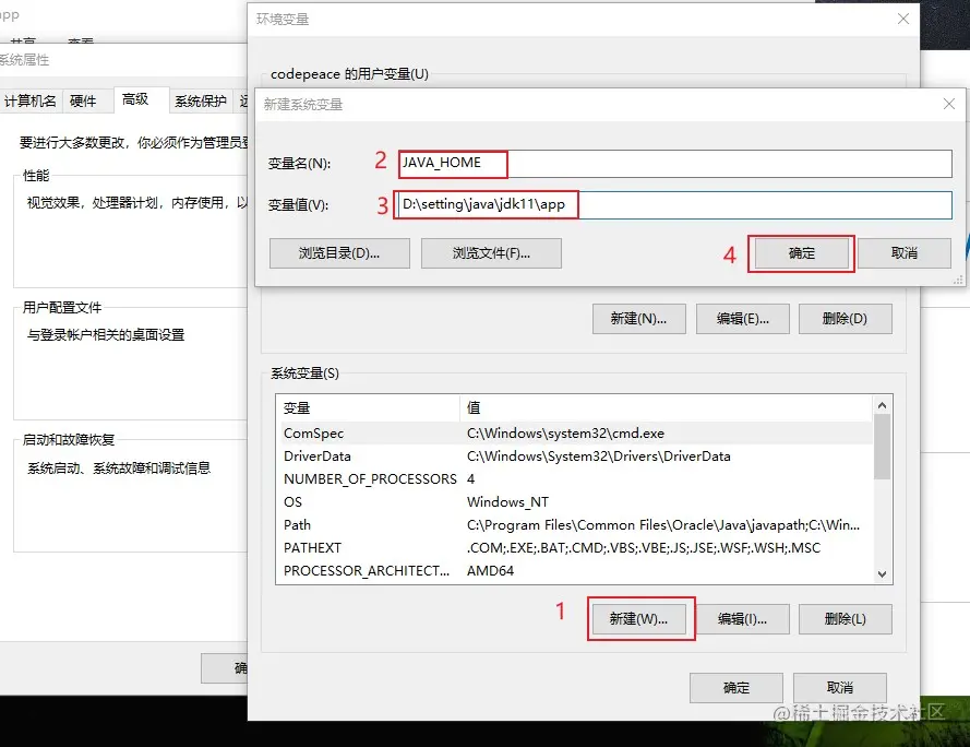 - 在“系统变量”中点击新建,然后在变量名中写入“JAVA_HOME”,并将刚才jdk下载所在路径复制粘贴到变量值中,然后点击确定,这一步主要是为了简化后面的配置,减少输入重复的路径。