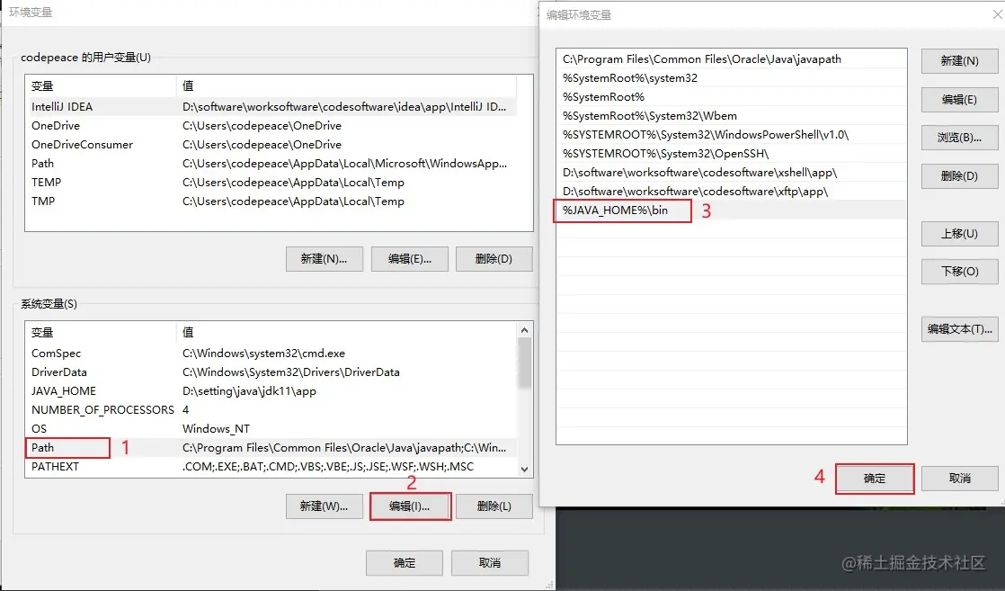 - 在“系统变量”中找到变量Path,选中Path后点击编辑,在Path的最后一行添加“%JAVA_HOME%\bin”,然后点击确定。