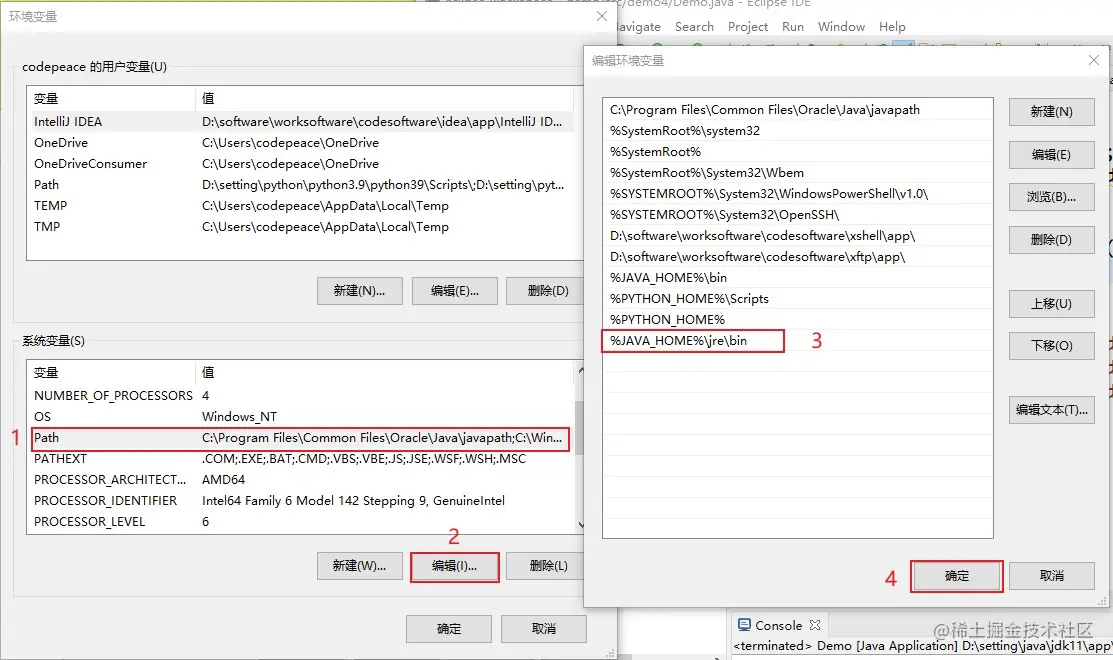 - 在“系统变量”中找到变量Path,选中Path后点击编辑,在Path的最后一行添加“%JAVA_HOME%\jre\bin”,然后点击确定。