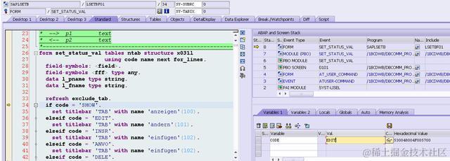 (2) 然后敲回车,SAP ABAP 调试器debugger在subroutine SET_STATUS_VAL 停下来,在调试器里将34行的变量code 内容从SHOW改成EDIT: