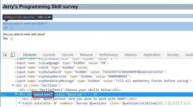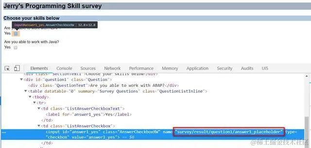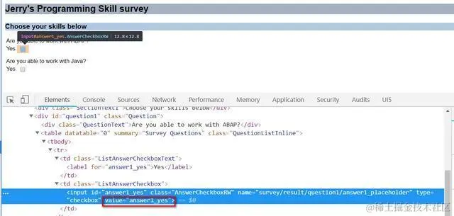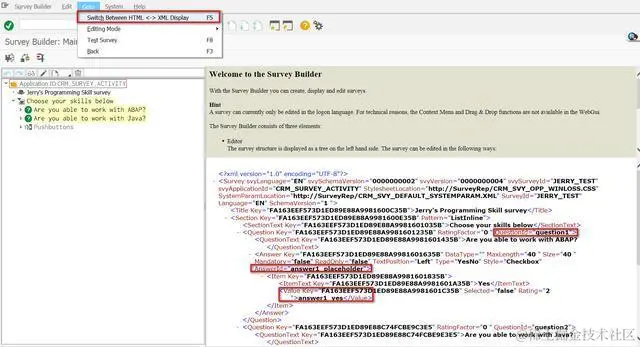 以第一个问题Are you able to work with ABAP?为例,使用菜单Goto->Switch Between HTML <-> XML Display显示该Survey的XML源代码:
