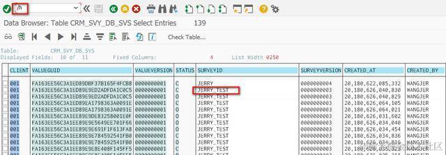 如果确实想看其内容,怎么办?在下面SE16页面的命令提示栏输入命令/h, 回车进入调试模式。然后双击某一行: