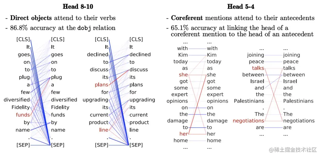 最近的一篇论文“ What Does BERT Look At?[1] ”阐明了BERT在预训练期间学到的东西。通过对BERT的self-attention机制的分析,很明显BERT可以学习大量的语言知识。例如,一些BERT的attention head关注动词的直接宾语,名词的确定词(例如定冠词),甚至是相关的提及(请参见下图)。值得注意的是,以无 监督的方式训练并且没有任何标记数据的模型能够学习语言的通用方面。