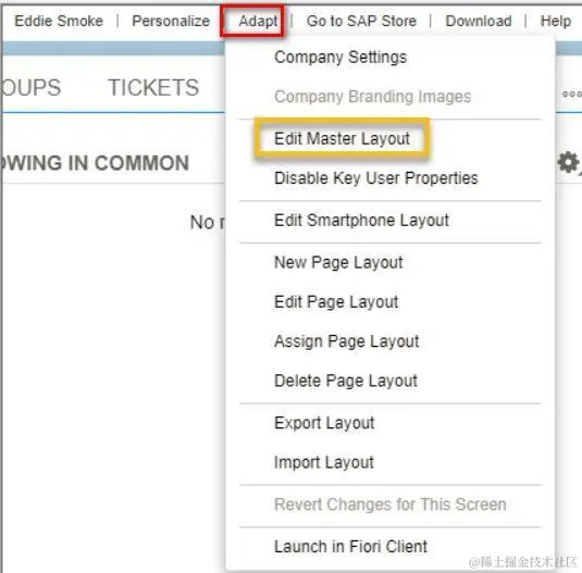 Key User Tool非常容易使用。如果想通过Adaptation的方式增强UI,登录C4C ,在顶部菜单栏选择Adapt -> Edit Master Layout(相应的,如果选择Personalization方式,则通过下图Adapt旁边的Personalize菜单项开始)。