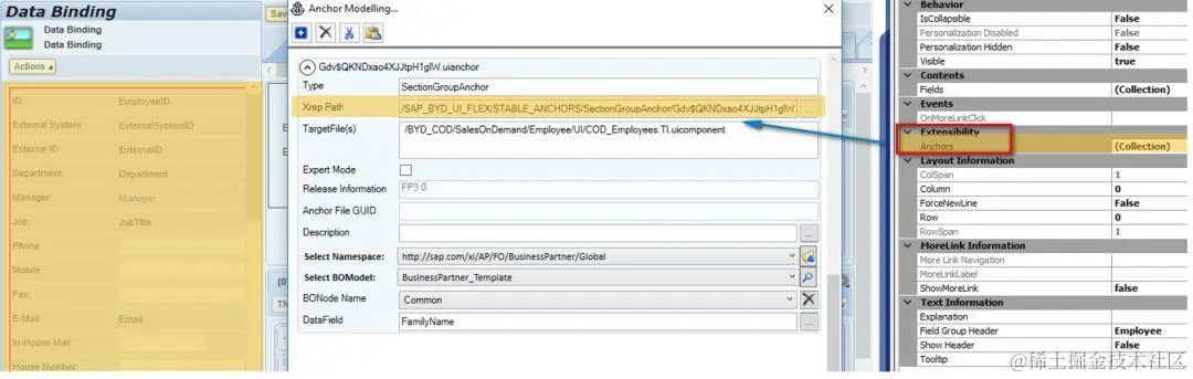 Anchor的中文意思是“锚点”,这个字用在C4C Extensibility注册这个上下文非常合适。每个Anchor指向了一个可以通过C4C Key User Tool进行增强的UI区域。我们用UI Designer中打开刚才修改了Manager字段Mandatory属性的Employee明细页面,发现Manager字段位于一个Section Group中。选中该Group,从页面右边的Extensibility属性中能发现维护有一个Anchor。该Anchor即我们之前研究的CT的XML内容里UsedAnchor字段的值。