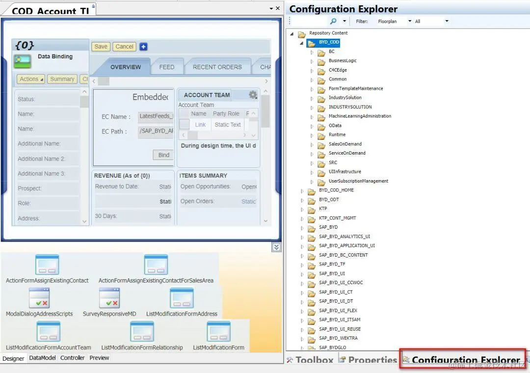 C4C后台有一个叫XREP的存储系统,设计思路和理念同Jerry介绍S/4HANA Extensibility时提到的LREP一致,只不过在C4C里换了一个名字而已,这里的X代表Cross。尽管C4C的客户和Partner无法像S/4HANA那样,登录后台查看XREP的全部内容,但仍旧可以通过UI Designer里的Configuration Explorer,查看XREP里的部分内容。如下图右边区域所示,XREP实质上就是一个用ABAP实现的分层的文件系统。