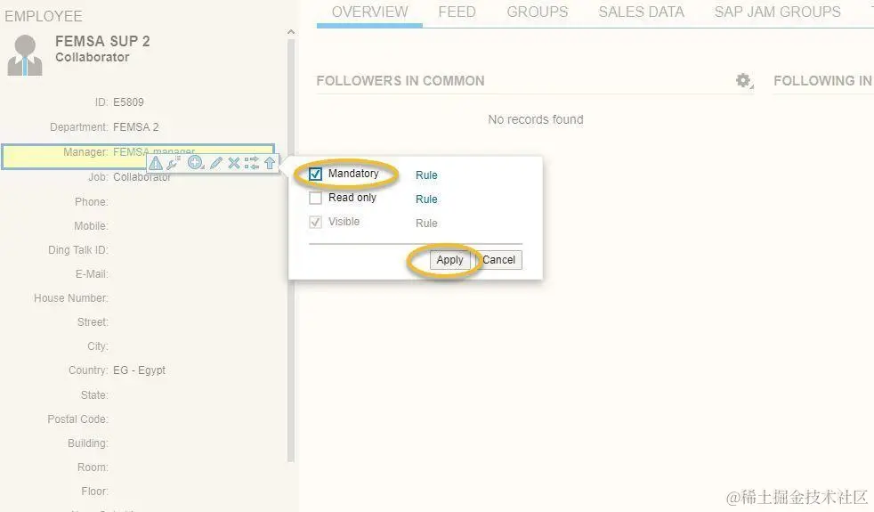 我们现在以Adaptation的方式修改一个标准字段的属性,然后观察伴随着这个修改动作,自动生成的CT到底是什么样子的。我们将Employee UI上Manager这个标准字段的Mandatory属性打上勾,意思是如果该字段未维护,则对Employee做的修改无法成功保存。