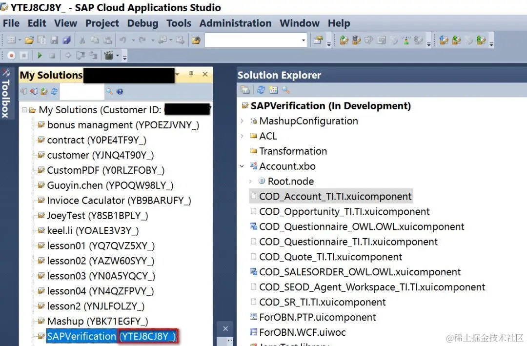 技术上讲,Adaptation产生的CT文件会存储在该用户所归属的Layer里。例如客户做的UI修改,会存储到名为$Cust的Layer中去。而Partner做的修改,存储到Partner对应的Solution独有的Layer下面。Partner Solution是C4C一个特有的概念,如下图Cloud Application Studio中的一个例子。大家可以把Partner Solution类比成ABAP Package的一个封装,一个Partner Solution里能存放Cloud Application Studio支持的各种资源,比如UI,BO,Web Service,OData开发等等。每个Partner Solution在XREP里都有对应的Layer。