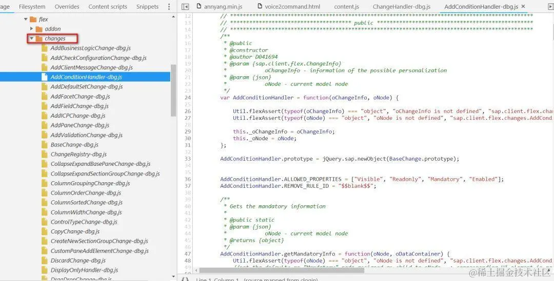 CT创建的触发是在UI端JavaScript代码中完成,然后投递到C4C后台的。在C4C UI端JavaScript的目录sap/client/flex/changes文件夹下,存放着不同类型的UI修改对应的处理器(Handler)。比如AddConditionHandler.js这个文件,负责响应用户在Key User Tool里对UI字段的属性做了修改的事件。