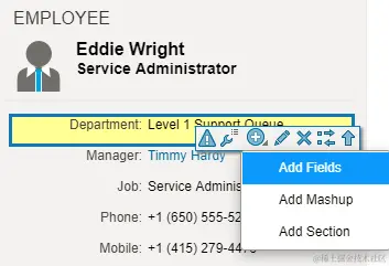 现在将光标悬浮在页面任意位置,如果页面被C4C后台设置为“可以增强”,那么能看到一个弹出的工具栏,点击里面的加号图标,就能从下拉菜单中选择“Add Fields”来进行字段的增强了。