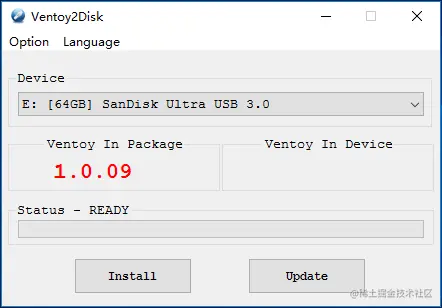 - Install:把 Ventoy 安装到 U 盘,只第一次时需要,其他情况只 Update 升级即可;