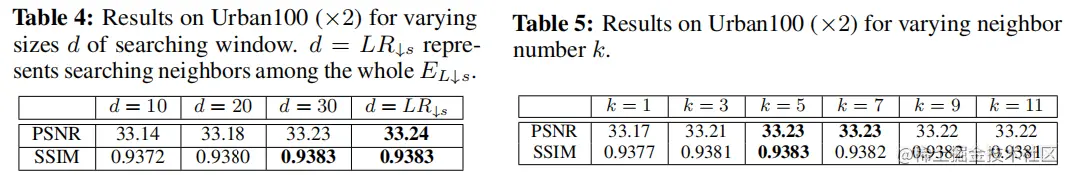 下面两个表分别对比了(1)不同搜索方位下的性能对比;(2)不同近邻数的性能对比。可以看到:搜索范围为30,近邻为5即可取得非常好的性能,进一步提升无明显提升。