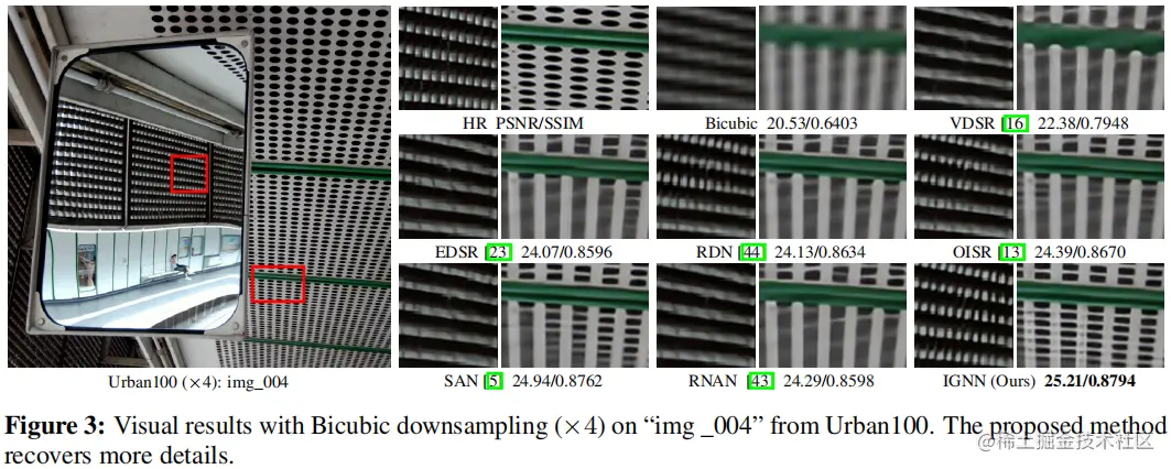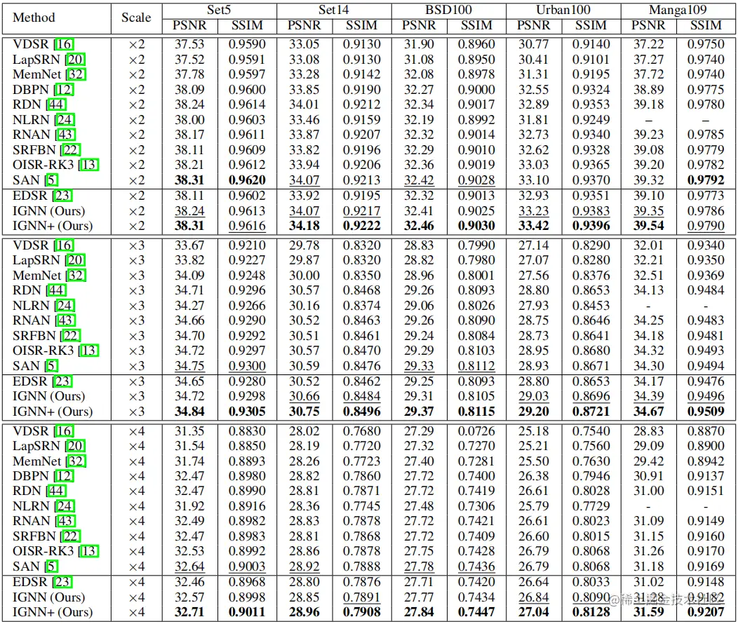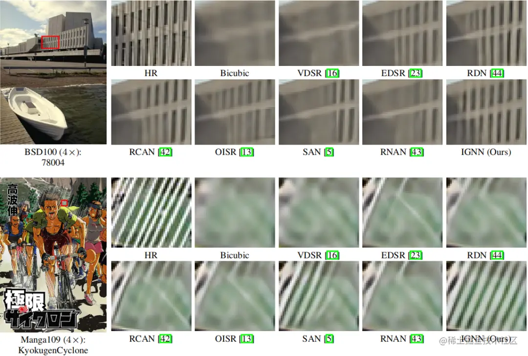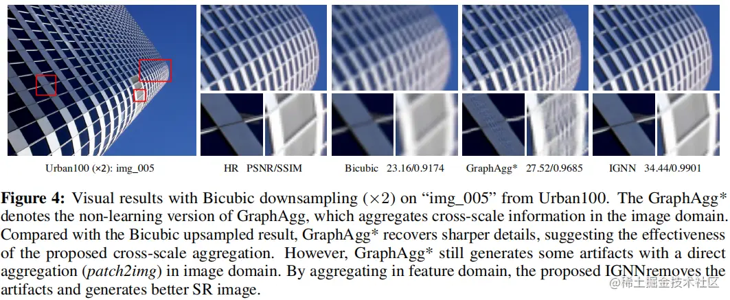 为验证所提方法的有效性,作者在DIV2K数据集上进行了训练,输入块大小为 ,同时采用随机镜像、旋转等增广。优化器为Adam,初始学习率为0.0001,每200000迭代折半,合计训练800000迭代。损失函数为 。在GraphAgg模块中,k=5,搜索窗口设置为30.注:GraphAgg是一种“即插即用”的模块,它可以轻易嵌入到其他超分网络中。