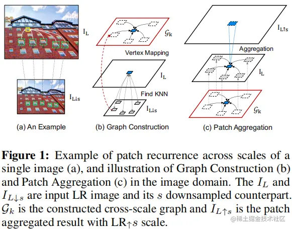 该文作者对自然图像中的跨尺度块相似块(即相似块可能出现在图像的不同尺度)进行探索,并提出一种新颖的Internal Graph Neural Network进行跨尺度的相似块探索,作者构建了一种跨尺度图用于为LR图像中的块搜k近邻相似块,得到k个HR近邻块并采用自适应集成方式进行信息汇聚。因此,HR信息可以通过k个HR近邻块传递给LR图像块并辅助图像纹理细节复原。