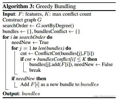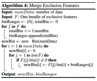 第二个问题是要确定绑定后的特征如何进行取值,其关键在于能够将原始的特征从合并后的特征中进行分离,也就是说绑定到一个特征后,我们仍然可以在这个绑定的bundle里面识别出原始特征。EFB算法针对该问题尝试从直方图的角度来处理,具体做法是将不同特征值分到绑定的bundle中不同的直方图箱子中,通过在特征取值中加一个偏置常量来进行处理。举个简单的例子,假设我们要绑定特征A和特征B两个特征,特征A的取值区间为[10,20),特征B的取值范围为[10,30),我们可以给特征B的取值范围加一个偏置量10,则特征B的取值范围变成了[20,40),绑定后的特征取值范围变成了[10,40),这样特征A和特征B即可进行愉快的融合了。特征合并算法伪代码如下所示: