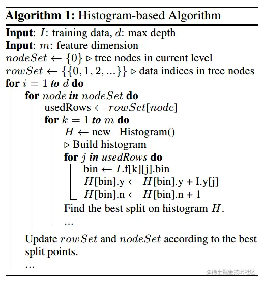 所以,从特征寻找最优分裂点角度,LightGBM使用了直方图算法进行优化。完整的直方图算法流程如下伪代码所示:\