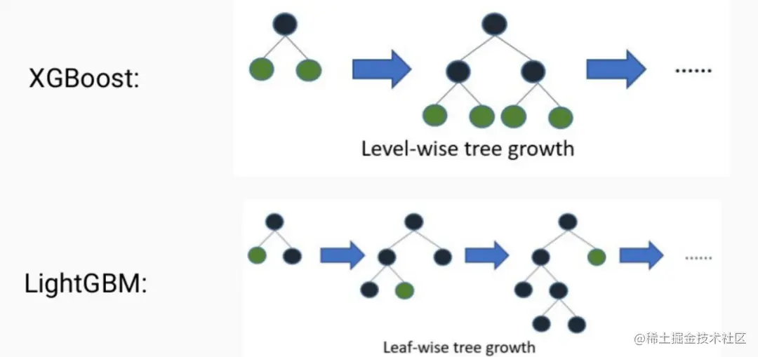 XGBoost采用按层生长的Level-Wise算法,好处是可以多线程优化,也方便控制模型复杂度,且不易过拟合。但缺点是不加区分的对待同一层所有叶子节点,大部分的节点分裂和增益计算不是必须的,带来了多余的计算开销。LightGBM提出了按叶子节点生长的Leaf-Wise算法,精度更高且更有效率,能够节约不必要的计算开销,同时为防止某一节点过分生长而加上一个深度限制机制,能够在保证精度的同时一定程度上防止过拟合。\