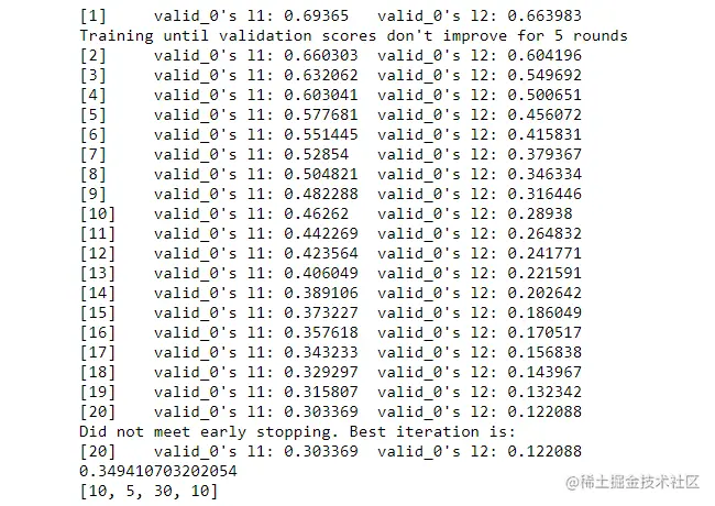 gbm.fit(X_train, y_train,eval_set=[(X_test, y_test)],eval_metric='l1',early_stopping_rounds=5)