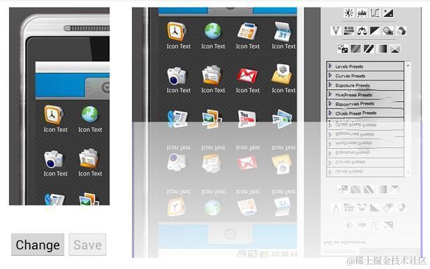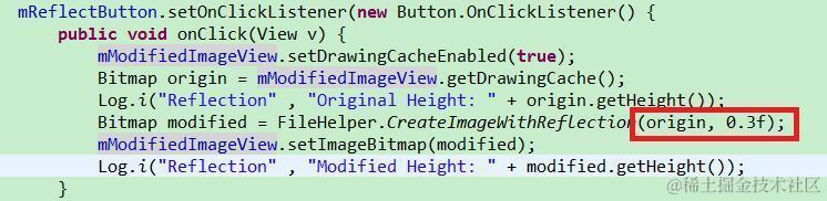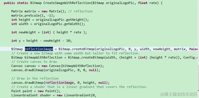 CreateImageWithReflection这个Java方法会根据传入的倒影率参数rate,创建一个对应高度的reflectionImage用于显示倒影,最后返回的Bitmap是包含了原始图片文件original image和倒影效果的一张联合图片union image: