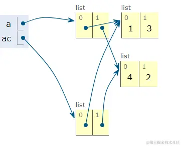 执行 a[1] = a 的时候,Python 做的事情则是把列表对象的第二个元素指向a所引用的列表对象本身。