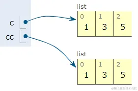 c和cc分别指向一片不同内存,示意图如下:
