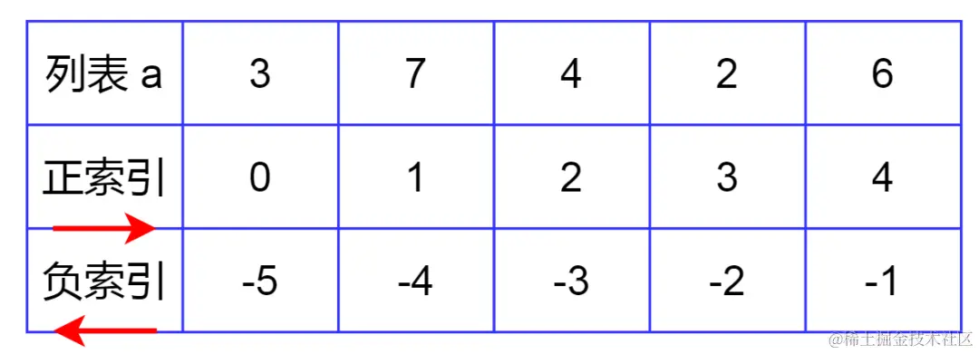 即从列表最后一个元素往前访问,此时索引依次被标记为-1,-2,...,-5 ,注意从-1开始。