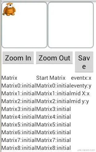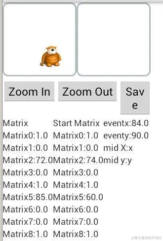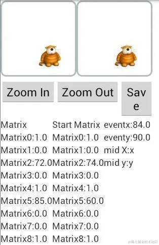 先看看效果吧。可以看到这个开发好的安卓应用有三个按钮:Zoom In缩小图片,Zoom Out放大图片和Save保存。
