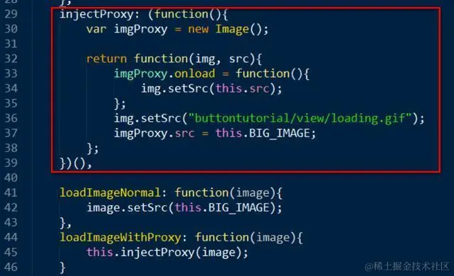 在injectProxy里,代码第30行创建了一个隐藏的Image代理对象,然后在第36行用真实的Image控件去显示本地的gif文件,以在UI上显示出动画效果,然后第37行用隐藏的Image代理对象去悄悄地加载大尺寸文件,这件事情终端用户并不知情。等到这个大尺寸图片加载完毕后,Image代理对象的onload回调函数会被浏览器触发,此时再让真实的Image控件把加载好的大尺寸文件显示出来。 效果就实现了。