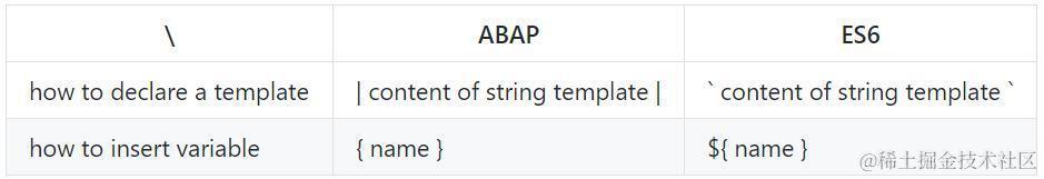 ABAP是我日常工作使用的编程语言,全称为Advanced Business Application Programming。语法和ES6是几乎完全一致的,只是ES6用成对的”`”来作为String Template开始和结束的标志,而ABAP用“|”。String Template里内部对变量的声明,ES6用的是${}, ABAP用的{}。