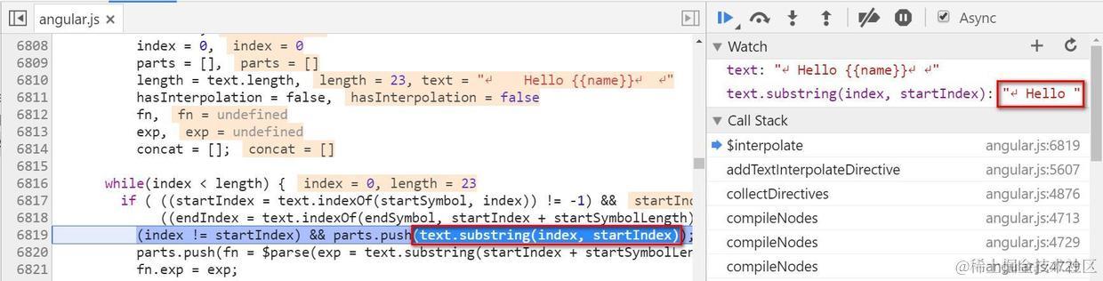 其实也没有什么高深之处,Angular首先还是会用JavaScript字符串自带的API indexOf去查找字符串内是否包含了startSymbol即{{, endSymbol即}}。