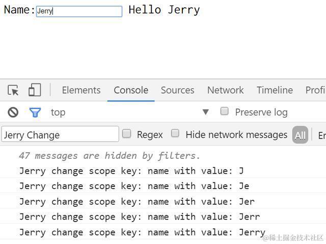 还是上面的例子,如果我输入单词Jerry,在Chrome开发者工具里会观察到下列的日志: