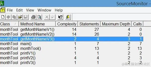 很快Source Monitor就将我们指定的Java文件的环复杂度计算完毕。点击菜单“Display Method Metrics”来查看结果: