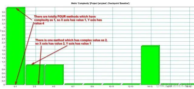 X轴的值代表每个方法的环复杂度,Y轴代表这些环复杂度的不同值出现的次数。