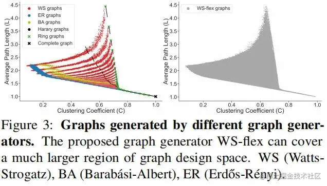 WS-flex可以生成更多样性的相关图,也就是说它几乎可以覆盖所有经典图生成方法所生成的图,见上示意图。它通过松弛节点的约束性得生成WS模型。特别的,WS-flex可以通过节点参数n、平均自由度k以及重置概率p进行描述。而图中的边数量可以通过 决定。WS-flex首先常见了一个包含 节点连接的图,然后随机挑选e与n节点并进行连接,最后所有边以概率p重置。作者采用WS-flex生成器在相应空间进行均匀平滑采样,最终得到了3942个图,见Figure1c。