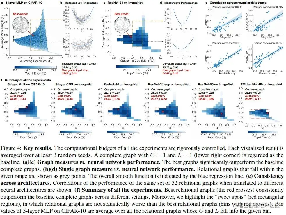 作者同时还设计了一种称之为"WS-flex"的图生成器,它有助于神经网络设计空间的系统探索。基于神经科学的发现,作者通过聚类系数与平均路径长度描述神经网络,这种网络架构具有灵活性与通用性,可以将其转换为多层感知器与卷积神经网络(见上图c和d)。
