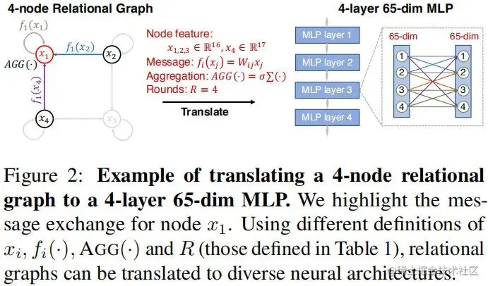 我们来考虑一种极端情况(输入与输出具有相同的维度),此时的多层感知器可以描述为完整相关图(complete relational graph),它的每个节点 与其他所有节点 相关联。定长全连接MLP具有特殊的信息交互定义, 。定长MLP是更广义模型下的一种特例,此时信息函数、汇聚函数以及相关图结构具有可变性。基于上述信息交互定义,此时有: