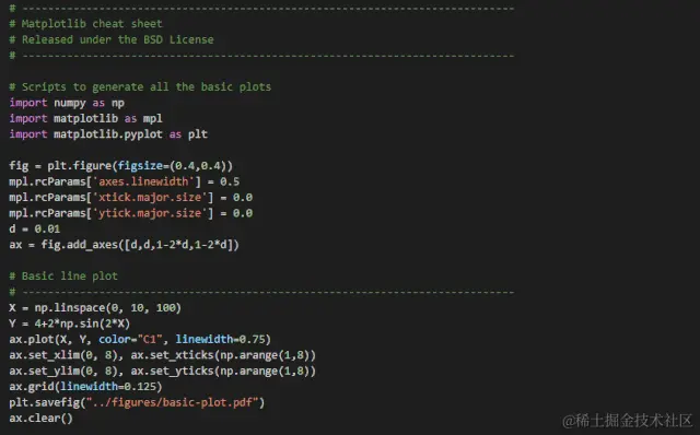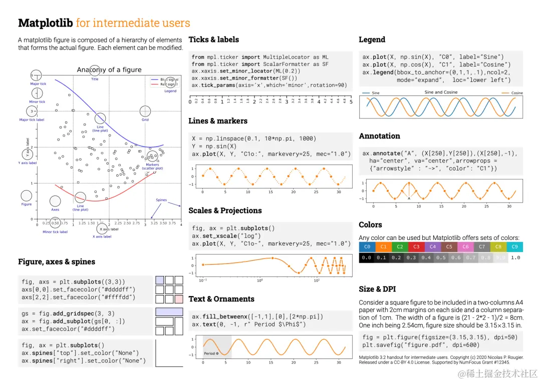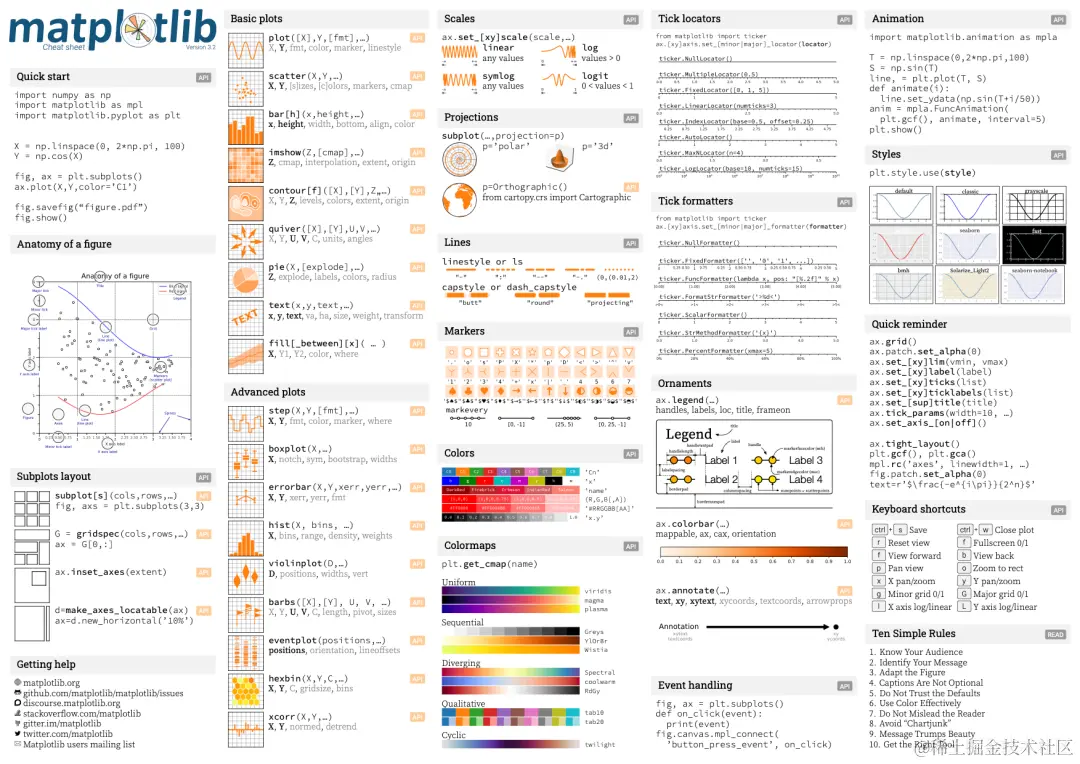 最近Matplotlib在GitHub上公开了官方的 cheatsheet 和所有用法的使用代码。看了下,用法基本覆盖了我们正常大部分使用需求,以后拿着这个小抄就可以搞定一切了,实在太香!