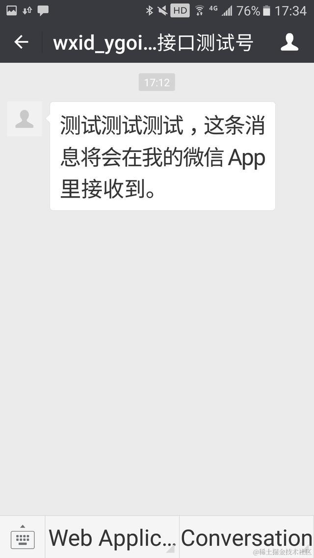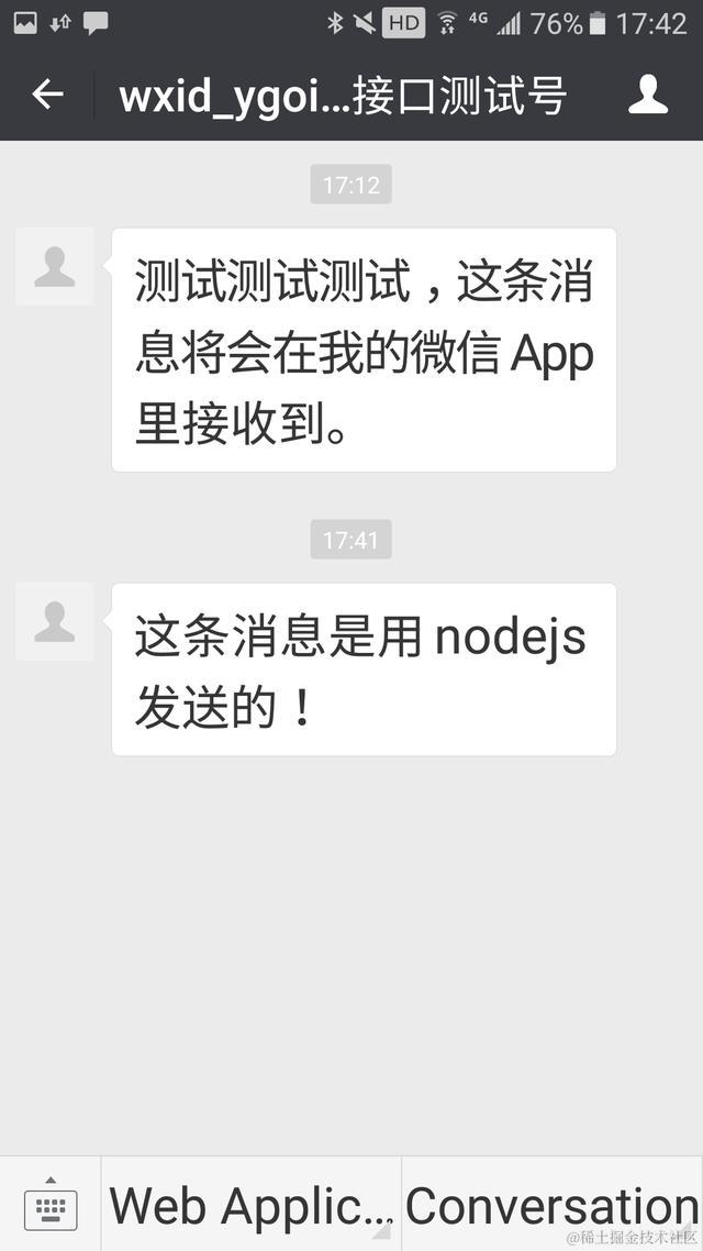 用node命名执行上面的代码,也能成功在微信app上接收到通过nodejs代码调用微信消息API的方式发送的文本消息。